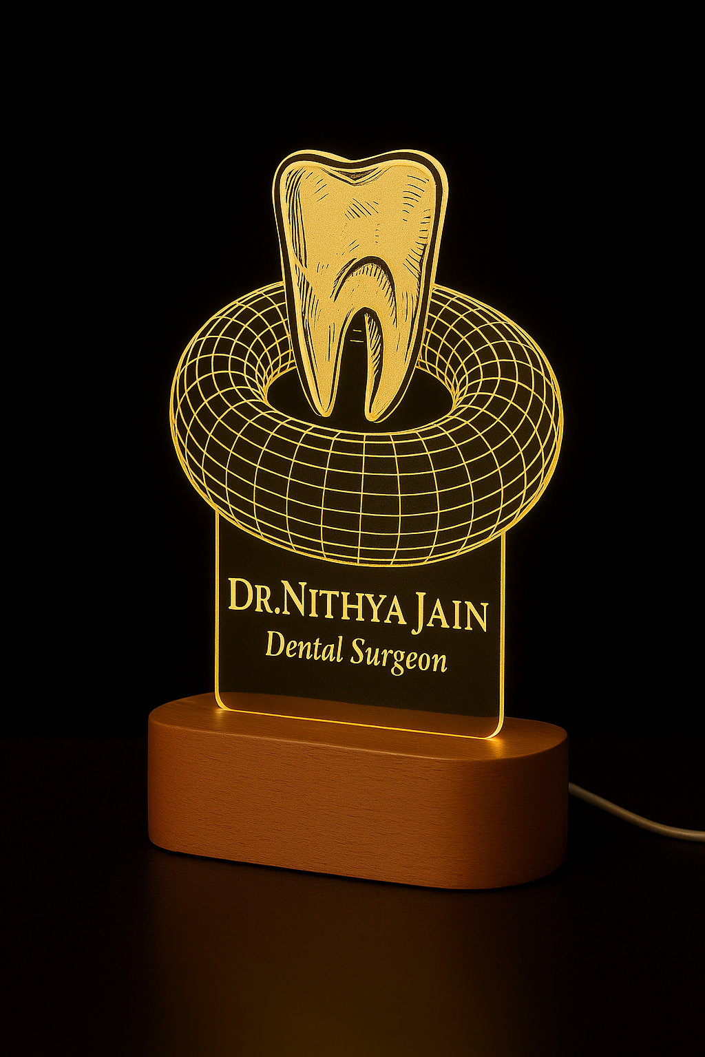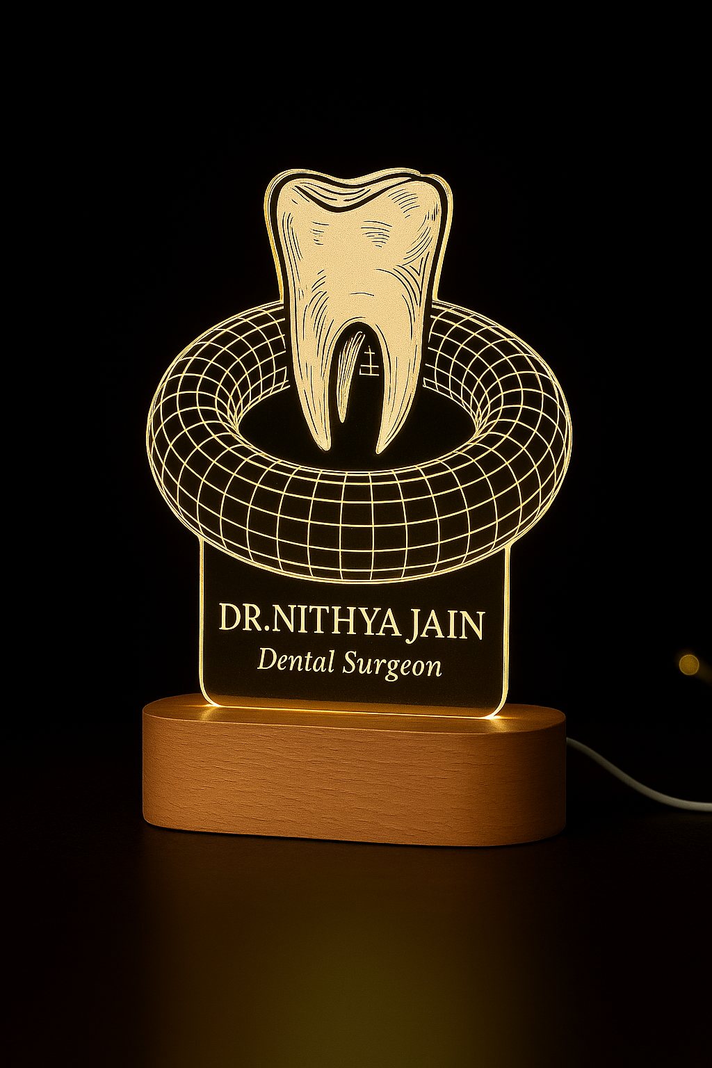 Design: UV-engraved 3D tooth with mesh design + custom name/text