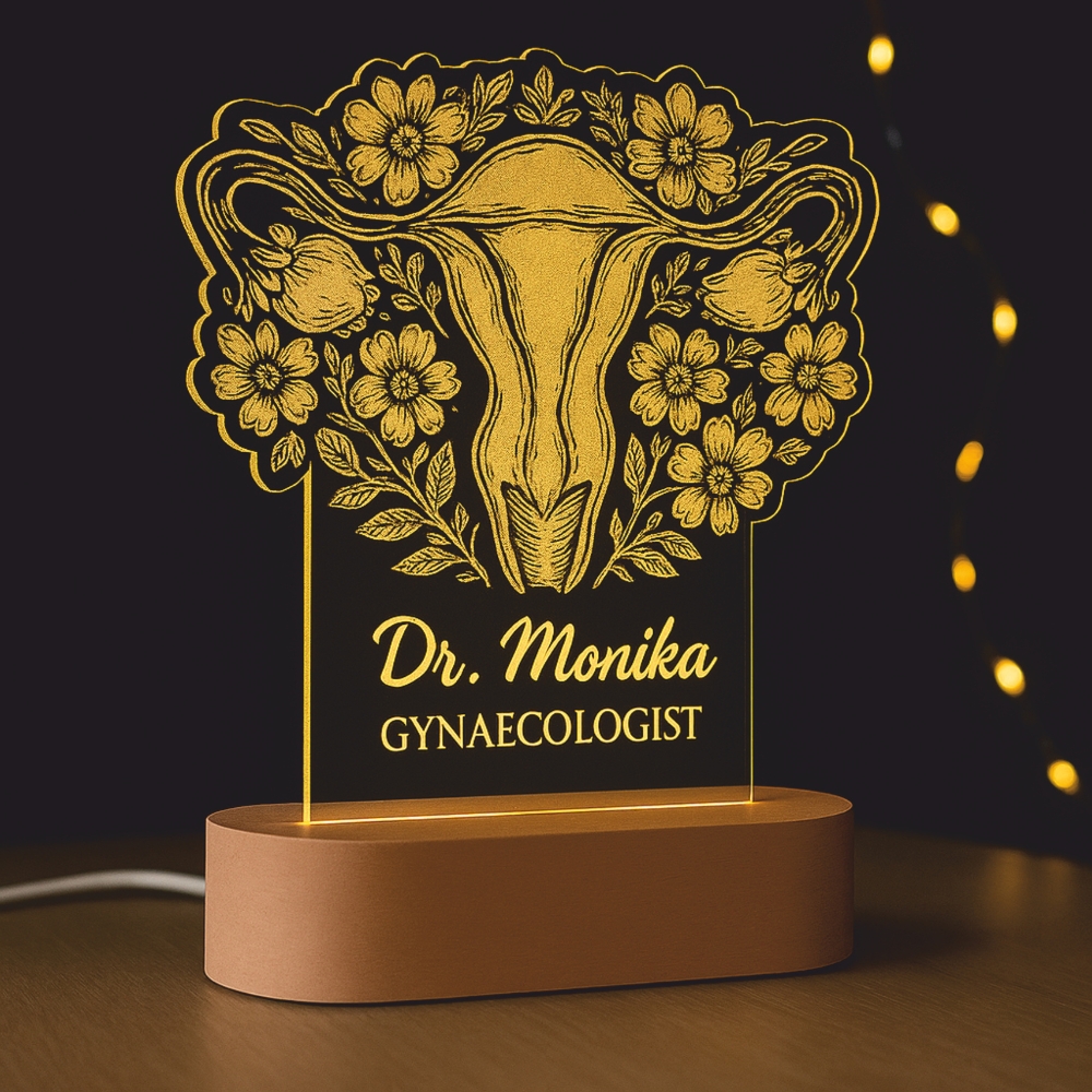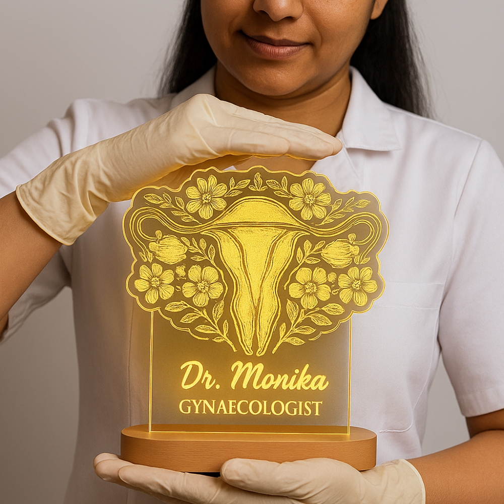 Design: Uterus illustration with floral border + doctor’s name/title